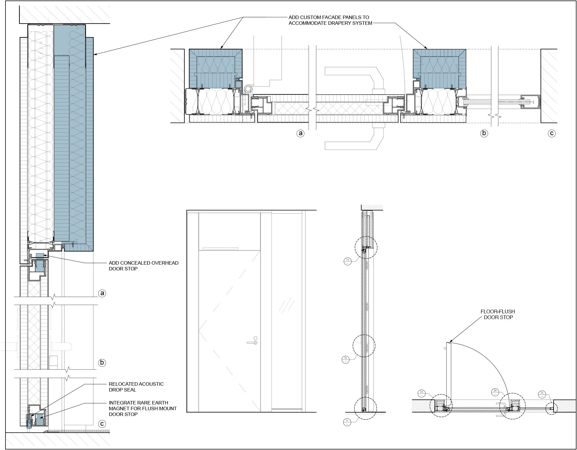 The privacy drapery system could not mount to our standard four-inch solid wall with center glazing. We extended the door frame depth to seven inches by fabricating three-inch matching wood panels that attach to the standard walls—creating proper mounting surfaces while preserving visual continuity.